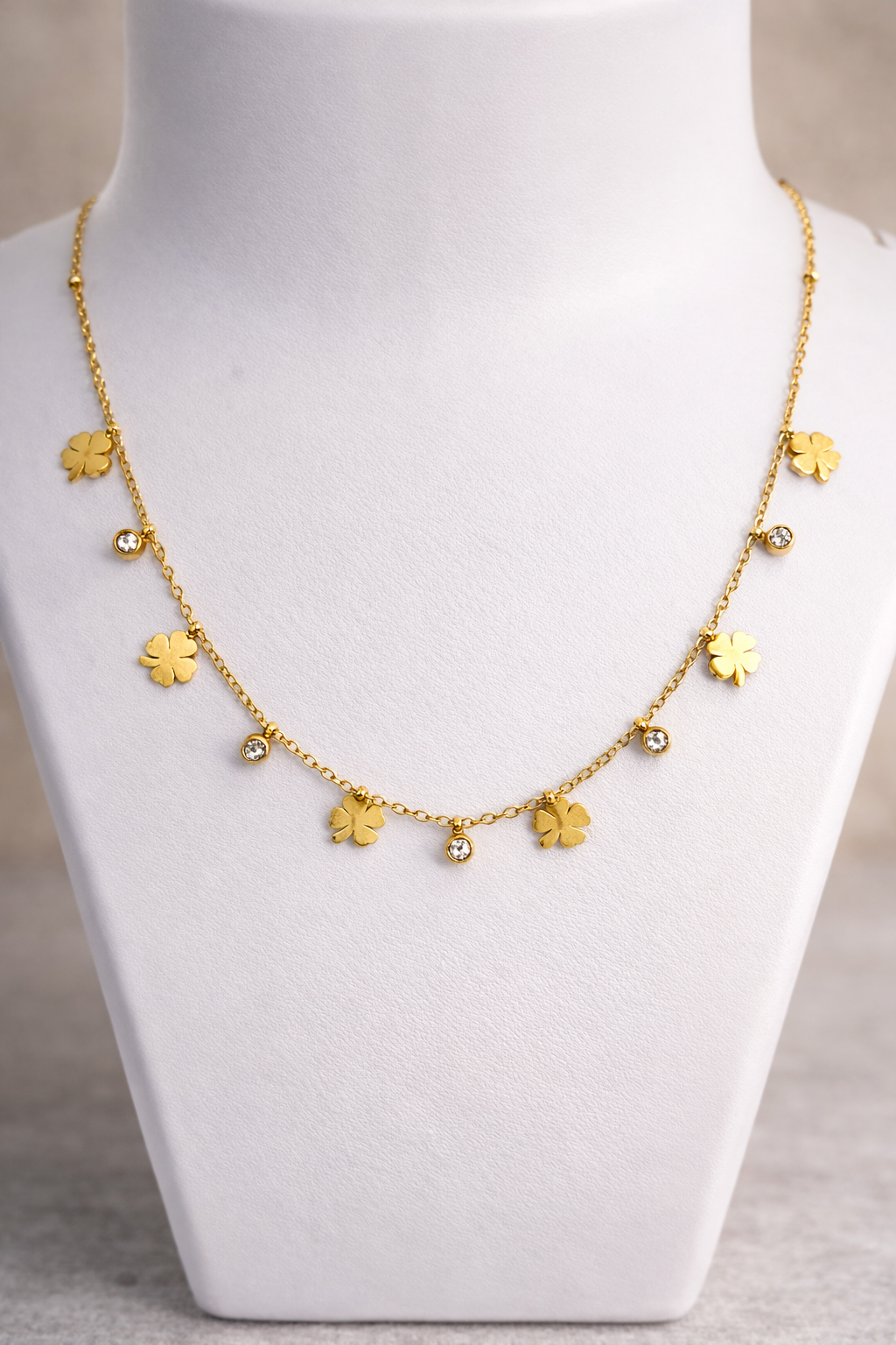The Golden Clover Charm Necklace is a timeless symbol of elegance, positivity, and refined craftsmanship, thoughtfully designed to enhance everyday style with effortless sophistication. Featuring a delicate gold-tone chain, the necklace is adorned with finely crafted clover-shaped charms accented by shimmering crystals that create a soft yet captivating sparkle. The carefully balanced charm placement forms a graceful silhouette that rests beautifully along the neckline, making it suitable for both subtle daily wear and special occasions. Traditionally associated with luck, harmony, and positive energy, the clover motif adds meaningful symbolism to this elegant accessory. Lightweight and comfortable, the necklace transitions seamlessly from casual daytime looks to festive and evening ensembles. Whether paired with sarees, kurtis, salwar suits, or contemporary outfits, it enhances your appearance without overpowering it. Ideal for layering or wearing alone, this versatile piece also makes a thoughtful gift for birthdays, anniversaries, and celebrations, adding timeless charm to any jewellery collection.