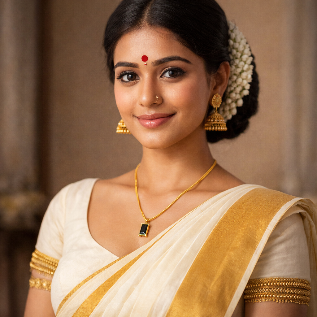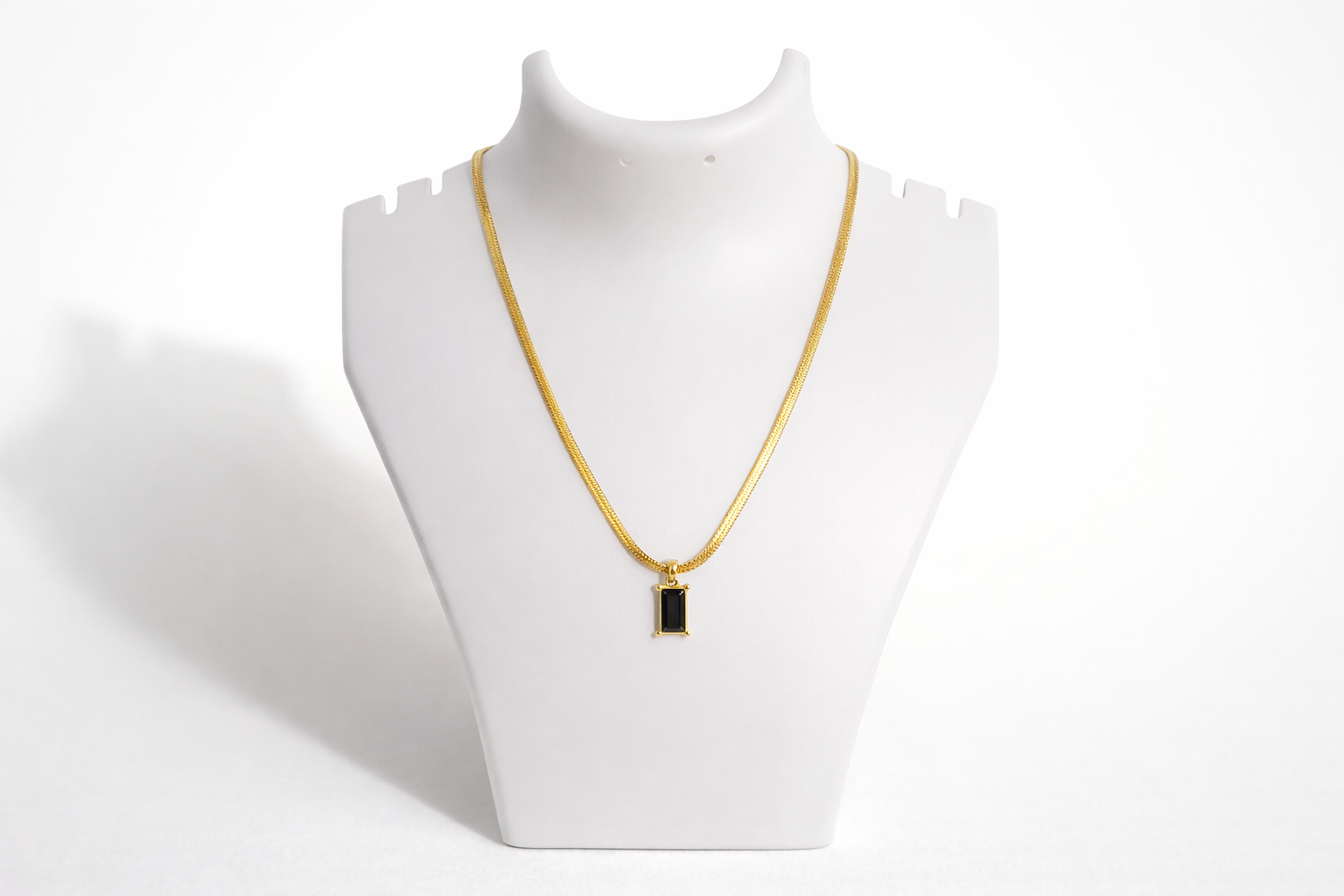 The Midnight Grace Gold Necklace is a refined expression of timeless elegance, simplicity, and modern sophistication. Designed with a sleek gold-tone chain and a striking black rectangular pendant, this necklace creates a graceful contrast that highlights understated luxury and contemporary style. The deep black stone symbolizes confidence, balance, and strength, while the warm gold finish adds classic charm, making it a versatile accessory for women who appreciate minimal yet impactful jewellery. Lightweight and comfortable, the necklace rests smoothly along the neckline, making it ideal for everyday wear as well as festive and evening occasions. Its elegant design pairs effortlessly with traditional outfits such as sarees, including Kerala kasavu sarees, as well as modern western attire, offering seamless styling versatility. Whether worn alone as a subtle statement piece or layered with delicate chains for a fashionable look, this necklace also serves as a thoughtful gift, adding timeless sophistication to any jewellery collection.